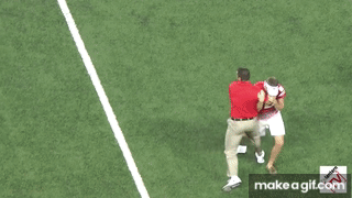 It was a fan that ran out onto the field, and made the mistake of running towards Schlegal, who was a pro linebacker, a Texas wrestling champion, trained in hand to hand combat at Air Force before transferring to OSU, and who likes to hunt wild boar with his bare hands.